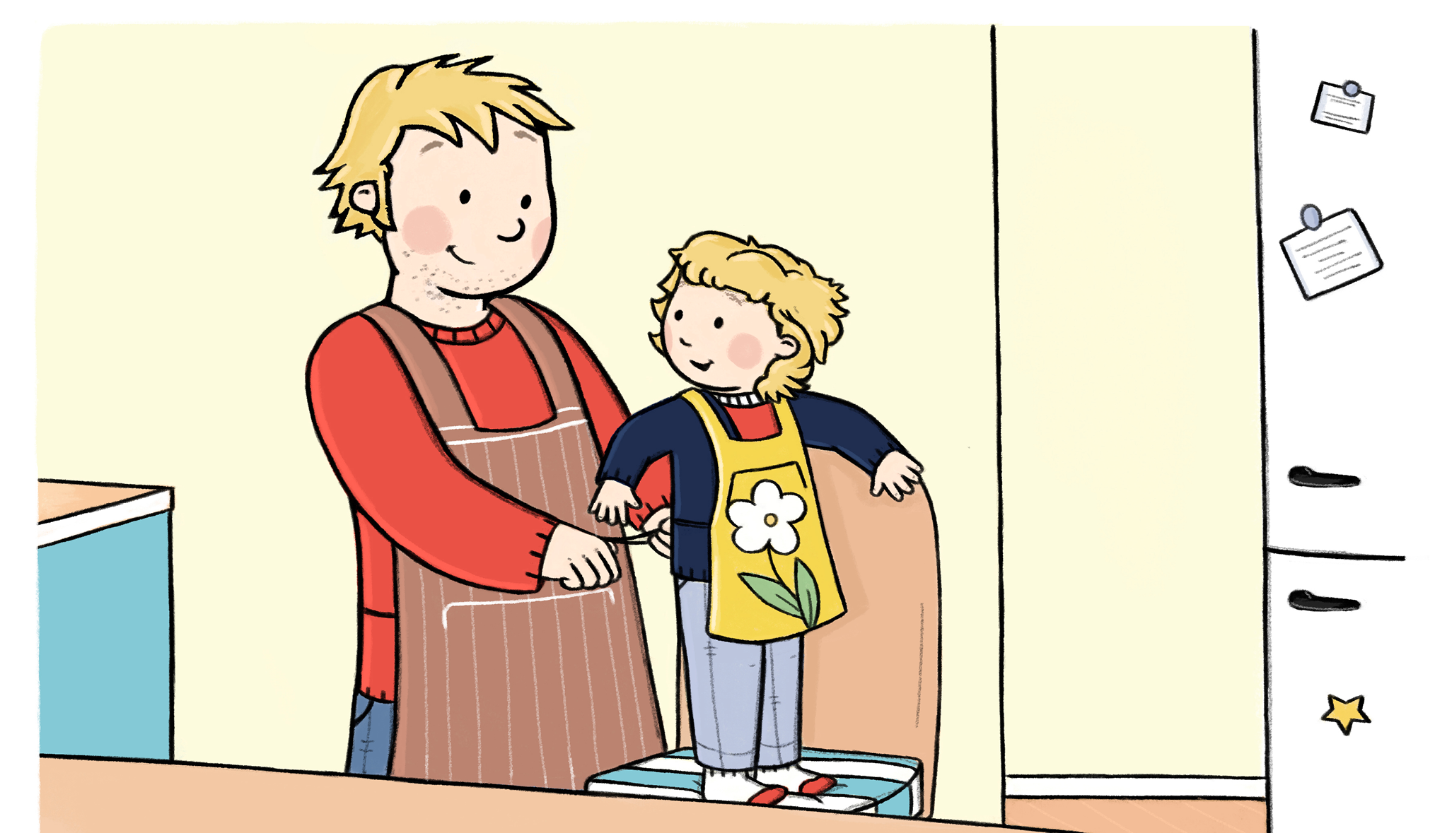 ”Bu sabah ne yapacağız?” Diye sordum babama. Kız kardeşin doğum günü partisinde olduğu için pasta yapabileceğimizi düşündüm, böylece pasta da yiyebiliriz ’dedi baba gülümseyerek. Sonra babam kendi önlüğümü giymeme yardım etti - üzerinde büyük bir papatya resmi var.