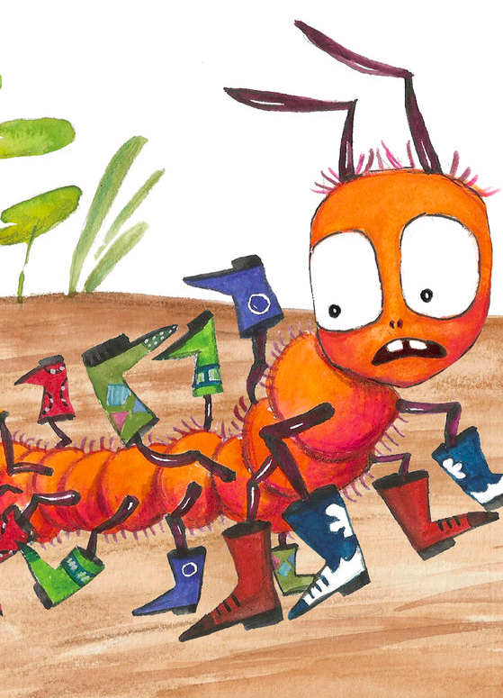 «Jeg starter bare med dette ...» sier Herr Tusenbein, og løfter på ben nummer fire. «Å nei! Jeg mener ... det der.» Han løfter på ben nummer åtte. «Å nei! Ingen av dem. Jeg mener, én av dem. Å nei! Jeg har glemt hva jeg mener!»